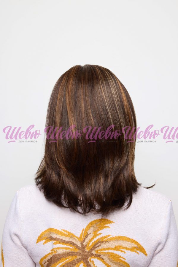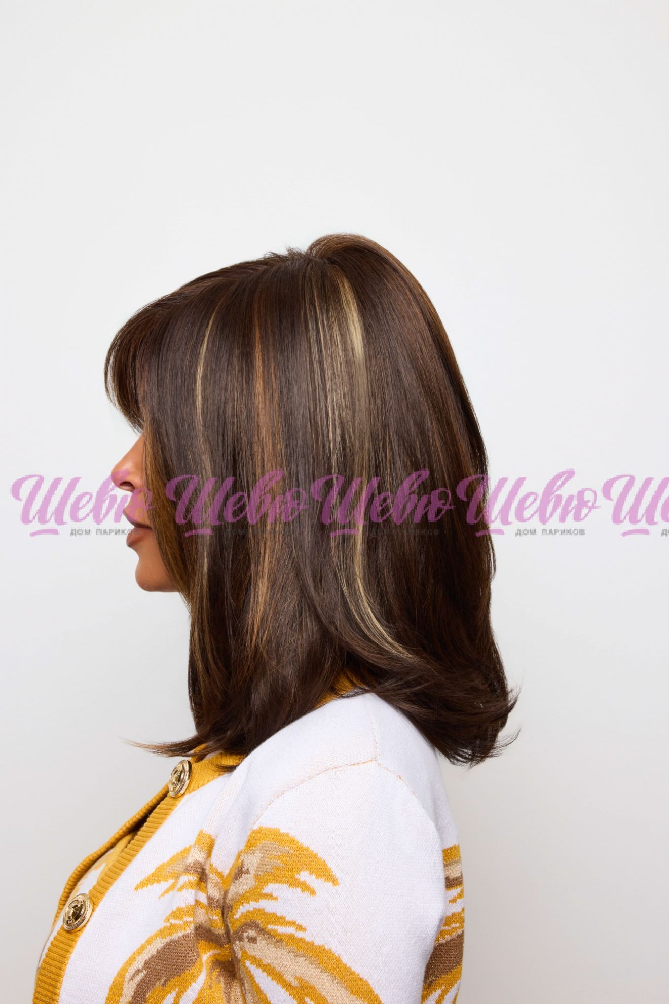 Верх шапки парика выполнен из материала, имитирующего кожу головы (Monofilament), позволяющего укладывать волосы сверху в любом направлении. В определенных местах шапки парика добавлены полоски полиуретана, препятствующие его соскальзыванию и служащие местом надежной фиксации парика на двусторонний тейп (скотч). В цветовой гамме модели присутствуют эффектные тона с темными корнями волос, которые придают парику еще более естественный вид. Kenzie – стрижка до плеч с длинной косой челкой и подкрученными кончиками волос. Мягкий контур прически с естественным объемом сгладит черты лица, придаст образу женственности и романтичности.